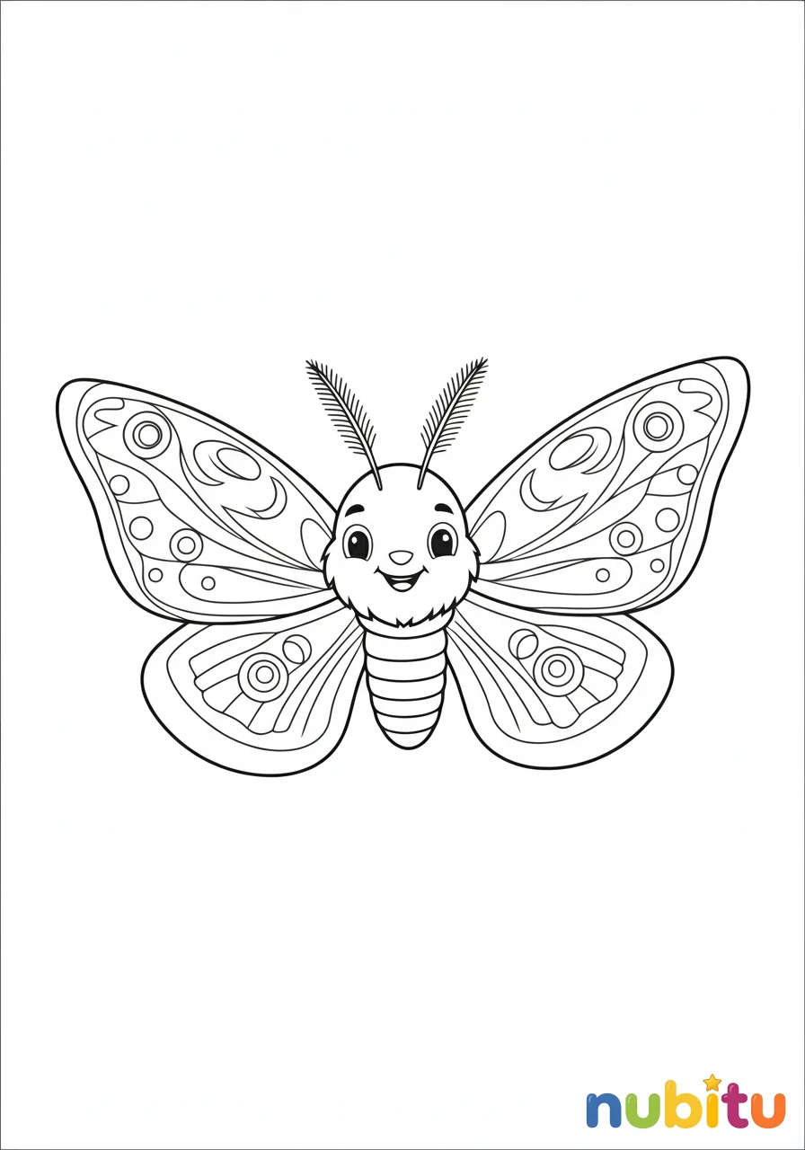 ¡Qué polilla Atlas tan simpática! Parece que te está sonriendo y esperando tus colores. Dale vida con tus lápices y marcadores, ¡será la más feliz de todas!