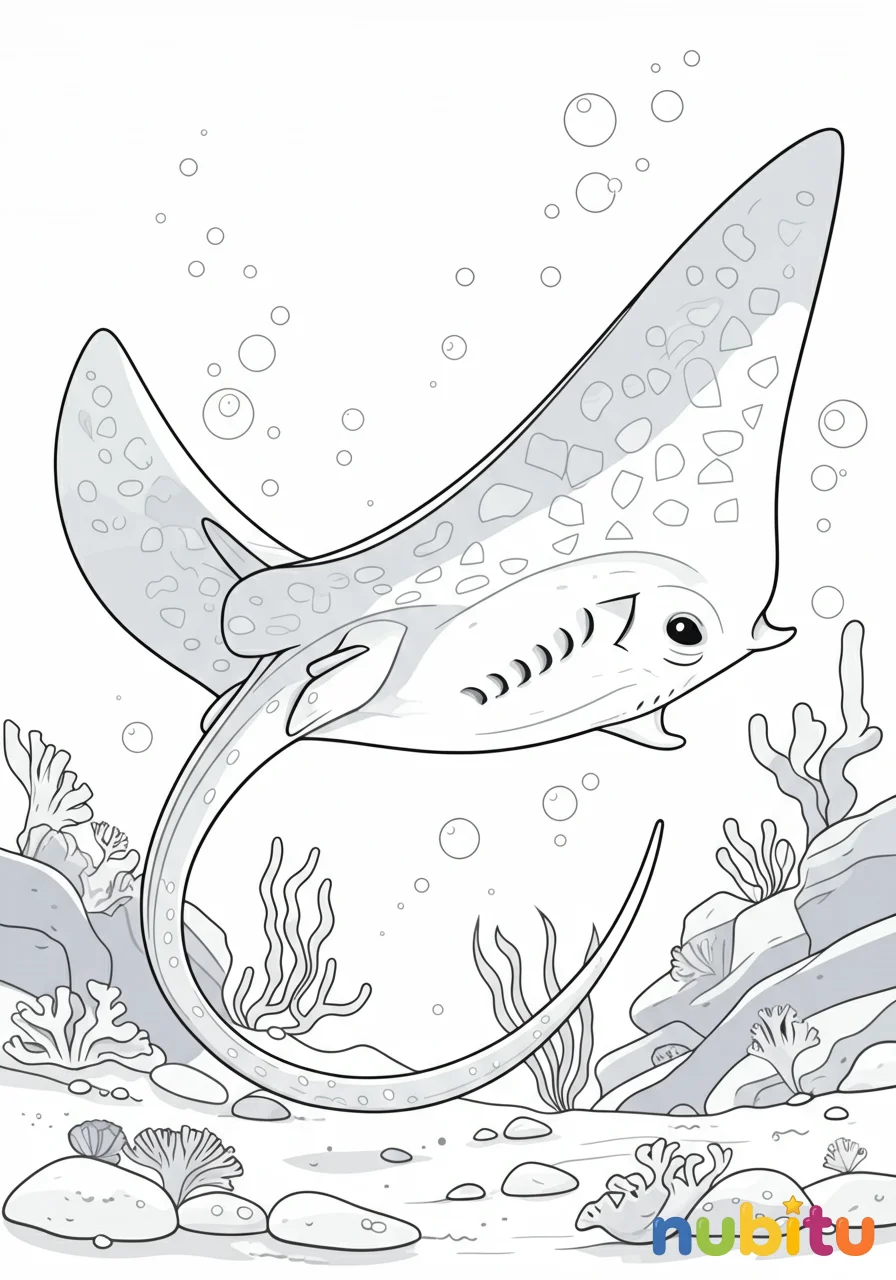 Una pequeña raya torpedo, curiosa y juguetona, nadando cerca de un coral, lista para ser llenada con colores brillantes.