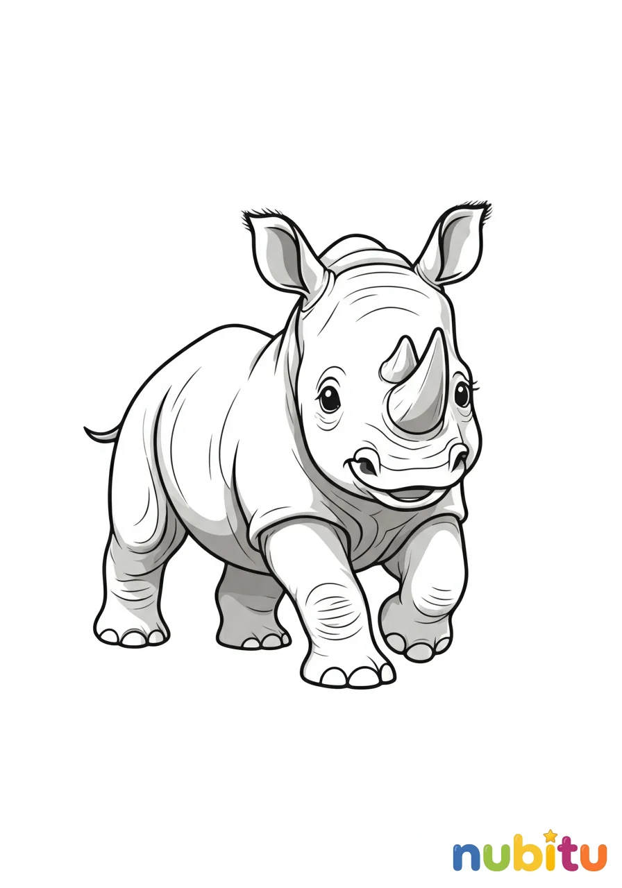 ¡Mira a este bebé rinoceronte blanco del norte dando sus primeros pasitos! ¿De qué color será su piel cuando lo pintes? ¡Seguro que le encanta correr!