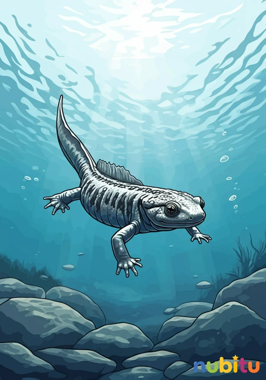 El chapoteo resonó en el viejo estanque. Nubitu, con su lupa de explorador y un cuaderno de bocetos bajo el brazo, se agachó para observar. No era una rana cualquiera, ni un pez común. Había oído historias, susurros de una criatura legendaria que habitaba las aguas frías de las montañas lejanas. Sus ojos brillaron de emoción. ‘¡Es ella!’, exclamó, señalando una sombra alargada que se movía con gracia entre las rocas sumergidas. Era una Salamandra Gigante China, tan grande como el brazo de un adulto, con una piel que parecía tallada por el tiempo. Nubitu se sentó en la orilla, sacó sus lápices y empezó a dibujar, imaginando cómo sería nadar junto a ella, explorando cuevas acuáticas secretas y descubriendo tesoros escondidos. La salamandra, curiosa, se acercó lentamente, observando al pequeño artista con sus ojos brillantes. Nubitu le sonrió y le mostró su dibujo, donde la salamandra aparecía nadando bajo un arcoíris submarino. La criatura pareció asentir con su cabeza ancha antes de deslizarse de nuevo a las profundidades, dejando a Nubitu con el corazón lleno de inspiración y la promesa de un nuevo dibujo.