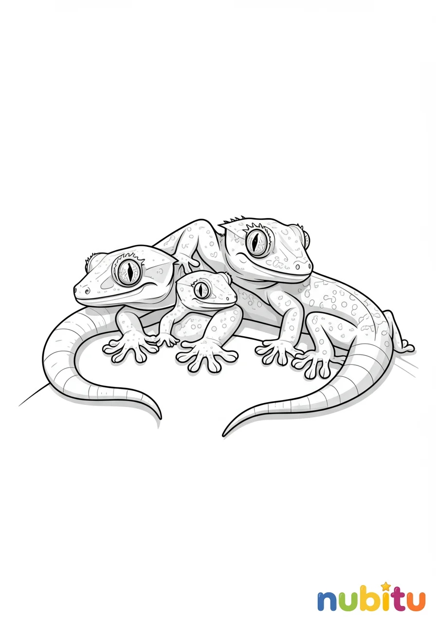 Un tierno dibujo de una salamanquesa adulta cuidando a sus crías, enseñándoles el mundo en un ambiente seguro y cálido, un momento familiar lleno de ternura.