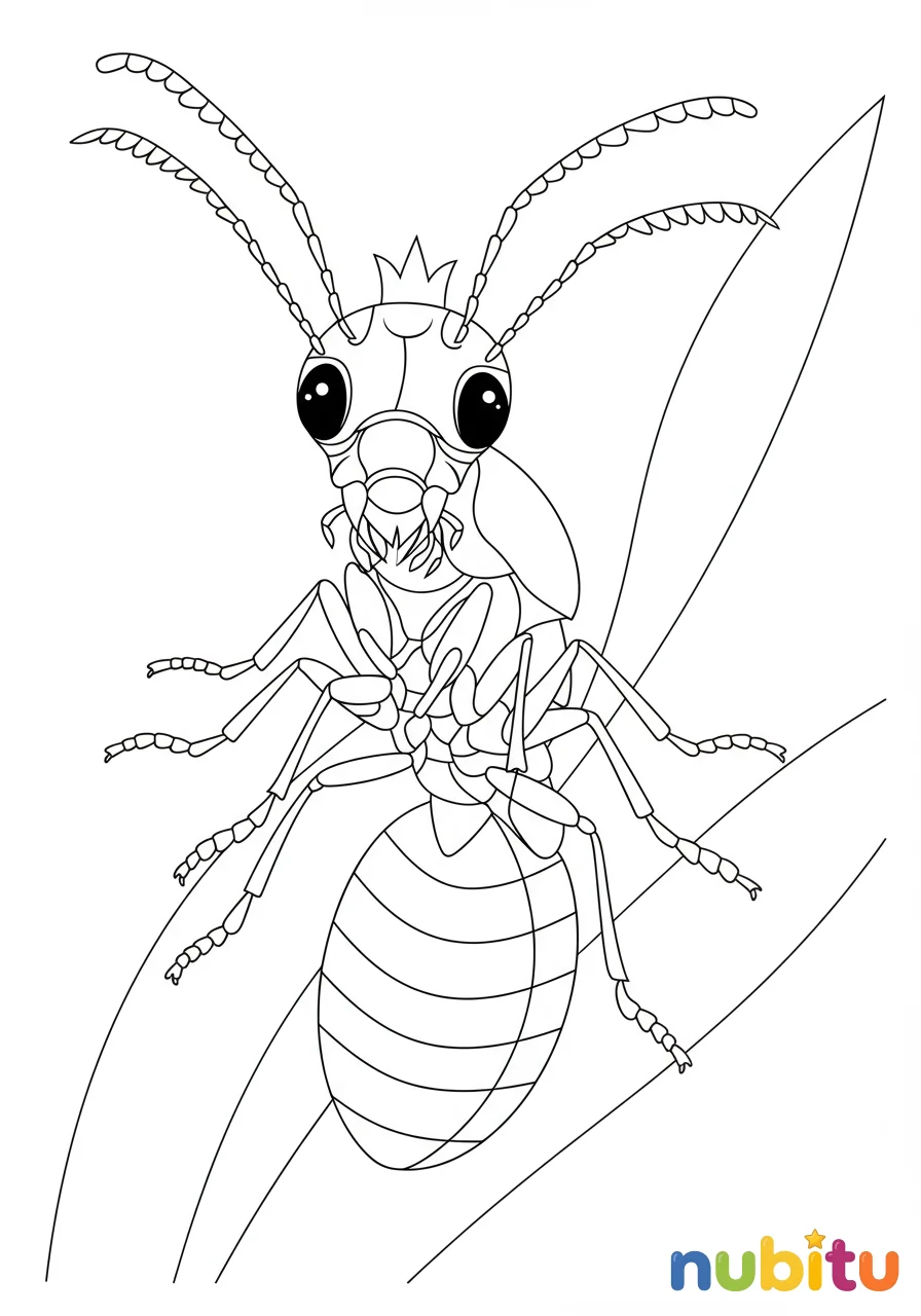 ¡Mira qué grande y elegante es esta Reina Termita! Ella es la mamá de miles de termitas y tiene una corona invisible de poder. ¿De qué color será su corona cuando la pintes?