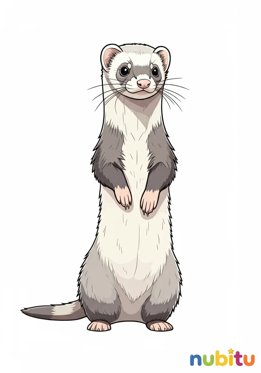 ¡Hola, pequeño artista! Aquí tienes un turón muy simpático que se ha puesto de pie sobre sus patitas traseras para saludarte. ¿De qué color serán sus orejitas y su nariz? ¡Usa tus colores favoritos para darle vida a este amiguito peludo!