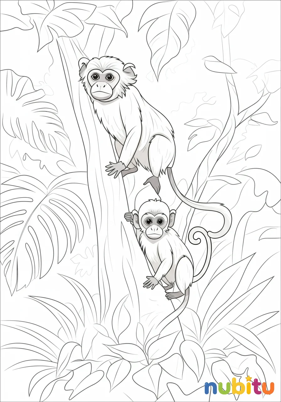 Observa a este pequeño uakarí calvo explorando su entorno con una mirada llena de asombro. Su pelaje largo y su expresión curiosa invitan a llenarlo de vida con tus colores favoritos.