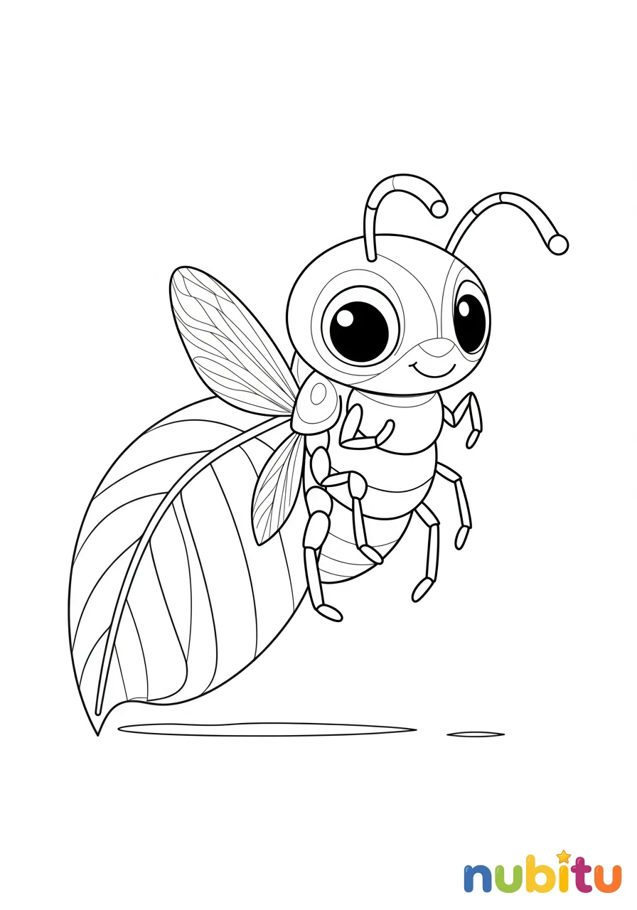 Una ilustración tierna de un joven insecto hoja, con sus delicadas formas aún en desarrollo. Se asoma desde el borde de una hoja más grande, revelando sus rasgos distintivos y su potencial para crecer y perfeccionar su disfraz natural. Ideal para un coloreado detallado.