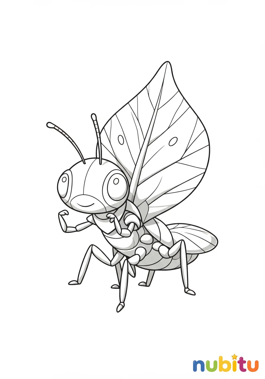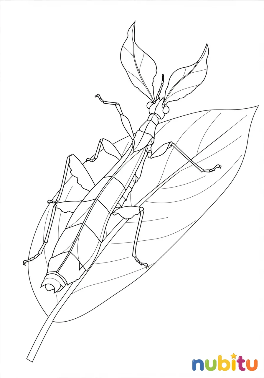 ¡Hola, pequeño explorador! Este amiguito insecto hoja te saluda con una sonrisa. Está listo para que uses tus lápices y le des vida con los colores más bonitos del jardín.