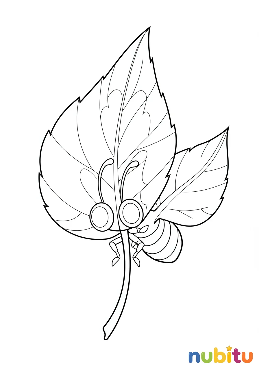 ¡Mira qué divertido! Este insecto hoja está asomándose y tiene muchas ganas de que lo llenes de colores vibrantes. ¿Qué tonos de verde elegirás para sus hojitas?