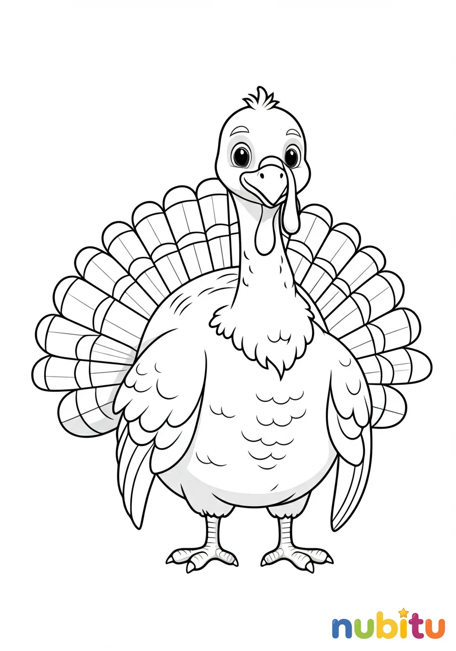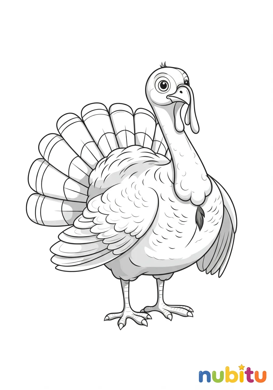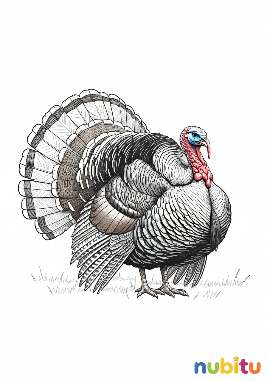 Una representación clásica de un pavo adulto, mostrando su cola en un espléndido abanico, invitando a los pequeños a capturar su majestuosidad con cada trazo.
