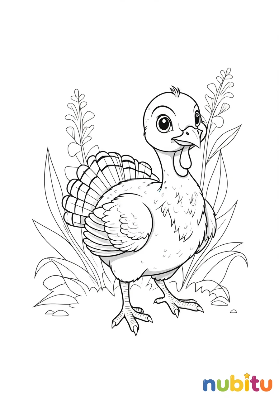 Un pavo joven explorando el entorno con curiosidad, sus plumas aún creciendo y su postura denotando una inocente vivacidad, perfecto para dibujar sus formas delicadas.
