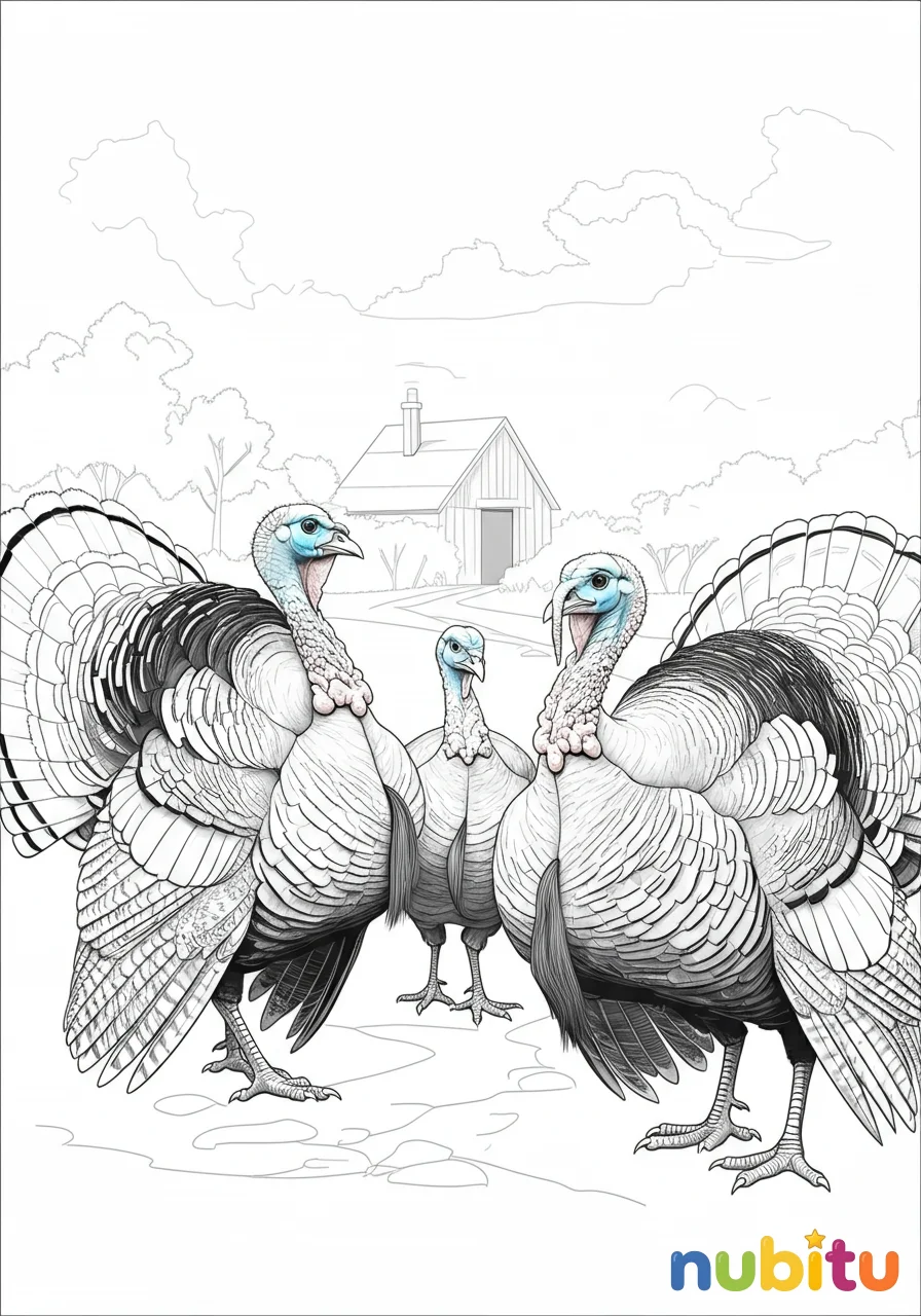 Una escena animada donde varios pavos interactúan en su hábitat, ofreciendo una oportunidad para practicar la composición y la diversidad de poses de estas aves.