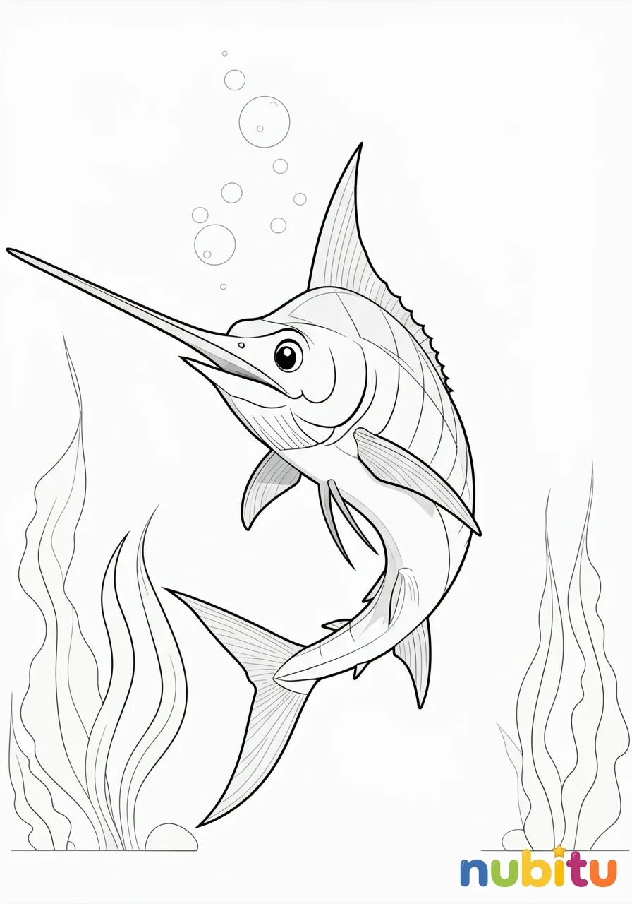 ¡Dibujar un pez espada es como embarcarse en una aventura submarina sin salir de casa! Es super divertido porque puedes imaginarte nadando con estas criaturas rápidas y elegantes. Cada línea que trazas te ayuda a entender mejor sus formas únicas y a darle tu propio toque mágico. Además, ¡es genial para practicar la precisión de tus manos y ojos, convirtiéndote en un verdadero capitán del dibujo! ¿Quién sabe qué historias inventarás para tu pez espada?
