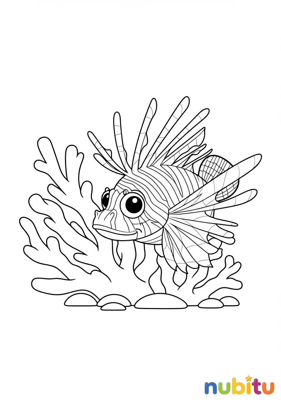 Un pez león juvenil, con sus características aletas pectorales y dorsales bien definidas, explorando las profundidades de un arrecife. Una oportunidad perfecta para practicar líneas y formas en tu obra de arte submarina.
