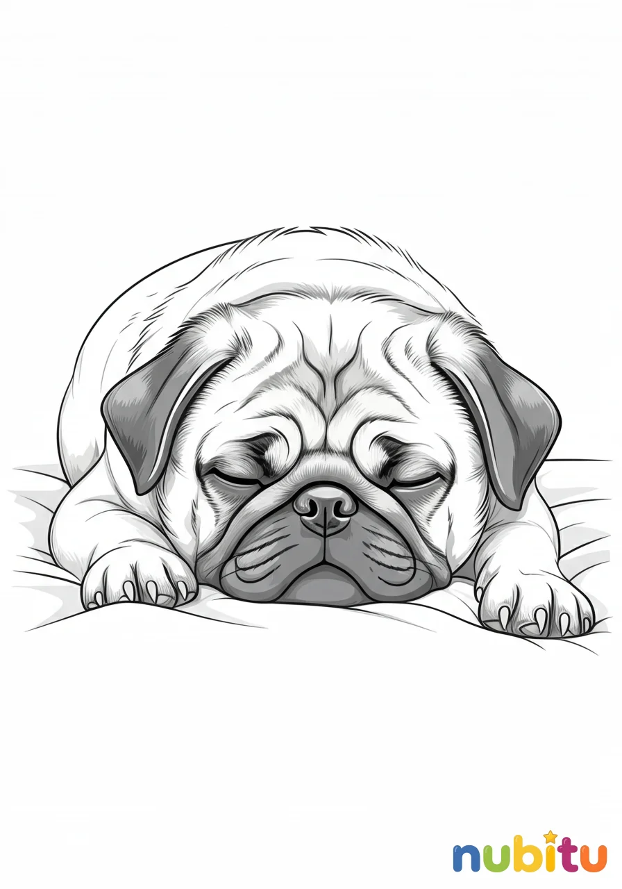 Este pequeño pug está tomando una siesta muy cómoda. ¿Qué colores suaves y acogedores usarás para su manta imaginaria y su pelaje?