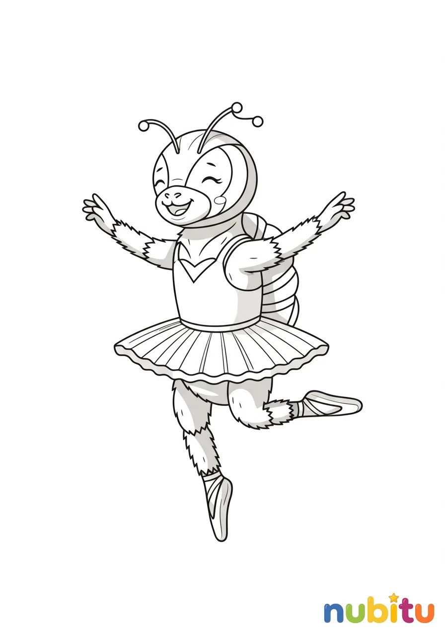 Pulga bailarina alegre, con tutú, realizando un salto elegante