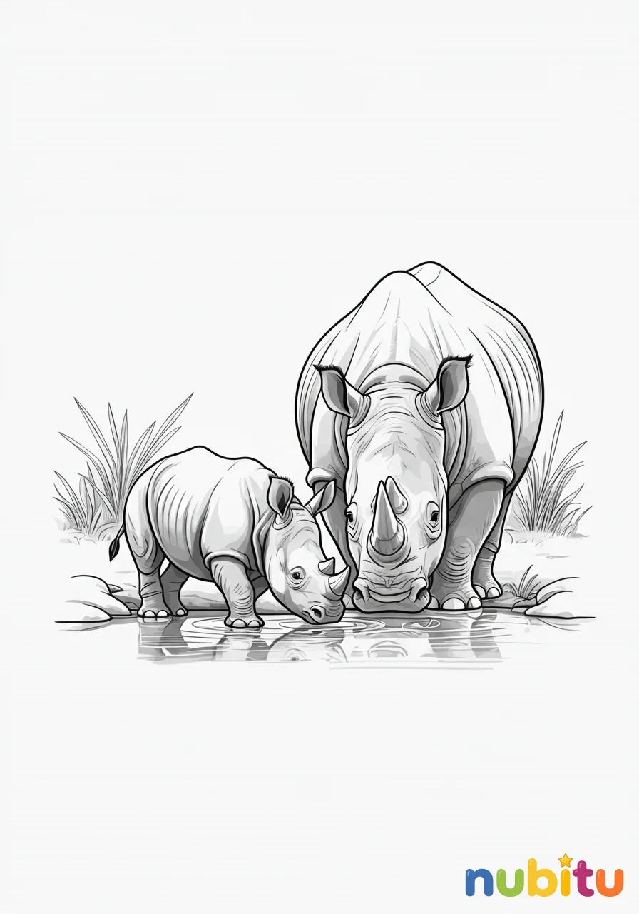 Una tierna escena de una madre rinoceronte y su cría bebiendo agua en un tranquilo abrevadero, con vegetación a su alrededor, simbolizando el vínculo familiar y la vida salvaje.