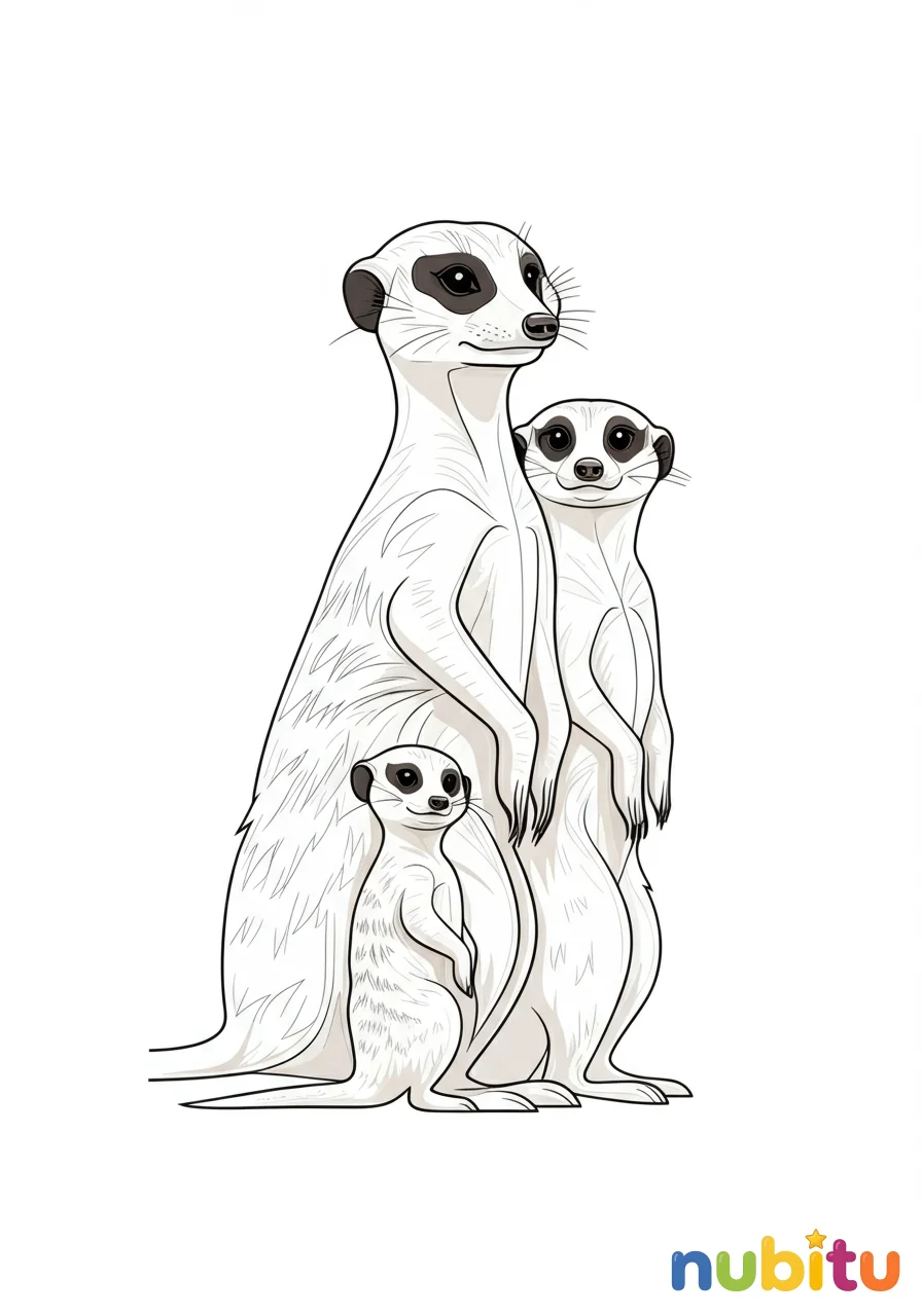¡Qué bonita familia de suricatas! Están todas juntas, disfrutando del día. ¿Puedes colorear a cada una con un toque especial y hacer que brillen como el sol?